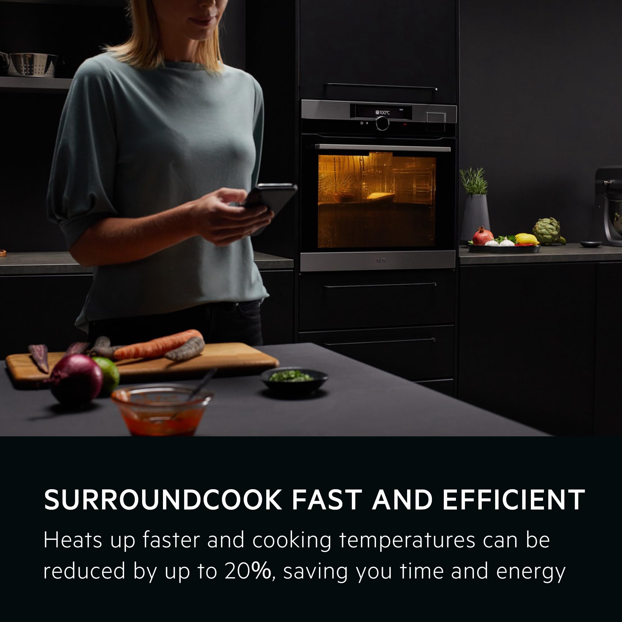 - GOOD TO KNOW – Take your baking from bland to grand with this AEG oven. The SurroundCook convection system blows hot air around the whole oven, so every meal is cooked evenly. Thanks to its fan technology, you’ll get a perfect golden brown finish on your pies and roasts – every part of your dish gets the heat it needs. You can also bake large batches of sweet treats with its XL baking tray that is 20% larger than the usual ones. And finally, when you’re done, Aqua Clean makes it effortless to wipe away those greasy residues using steam – no elbow grease required.
