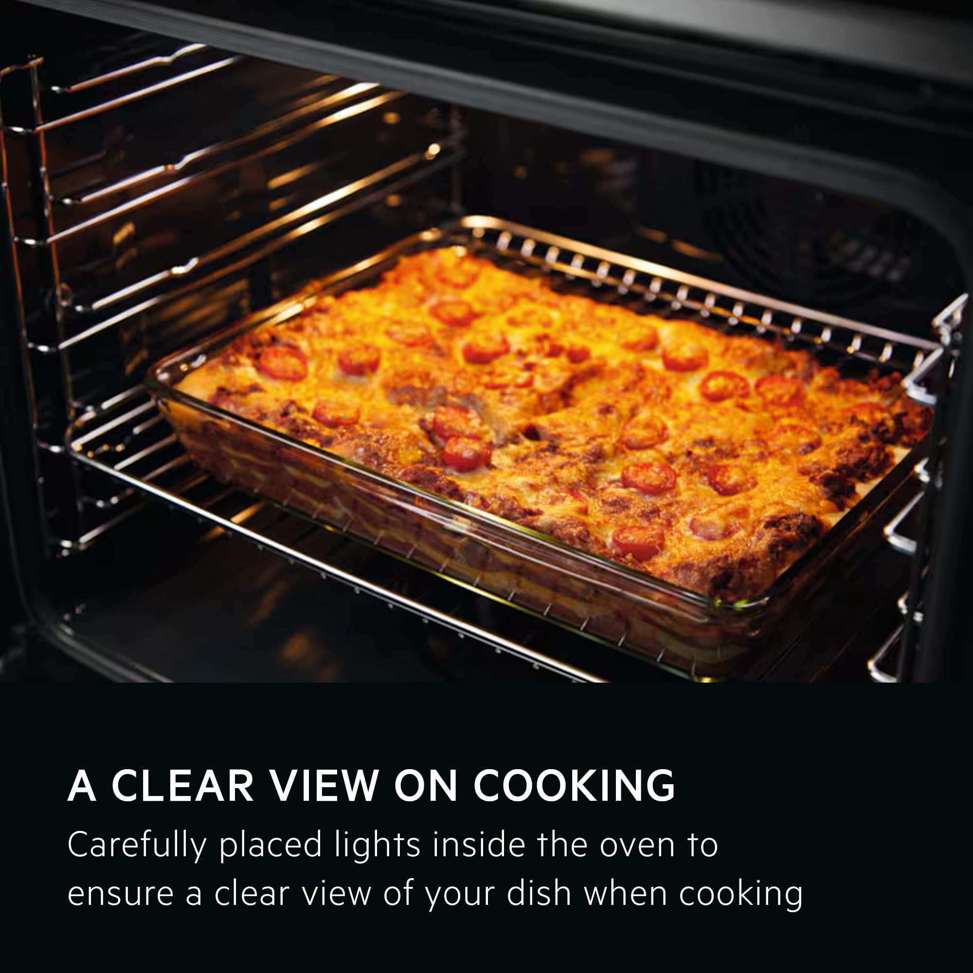 - FAST AND EFFICIENT COOKING WITH SURROUNDCOOK – Make mealtimes a doddle with this AEG electric single oven. It’s multifunctional, so you can roast, bake, and grill to your stomach’s content. Plus, with clever SurroundCook tech, heat is evenly distributed all around the oven. You’ll get a perfectly crispy finish on the pizza on the top shelf as well as the chicken nuggets below.